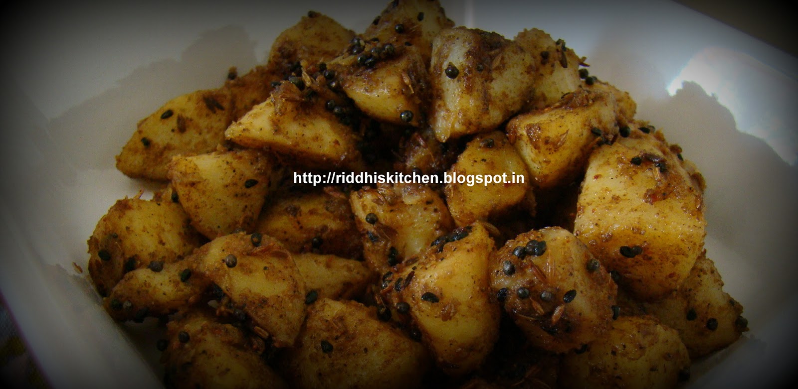 Take one pan heat ghee. Add muster seeds , cumin seeds , hing , oninos seeds , kala til , boiled potatoes and mix well.