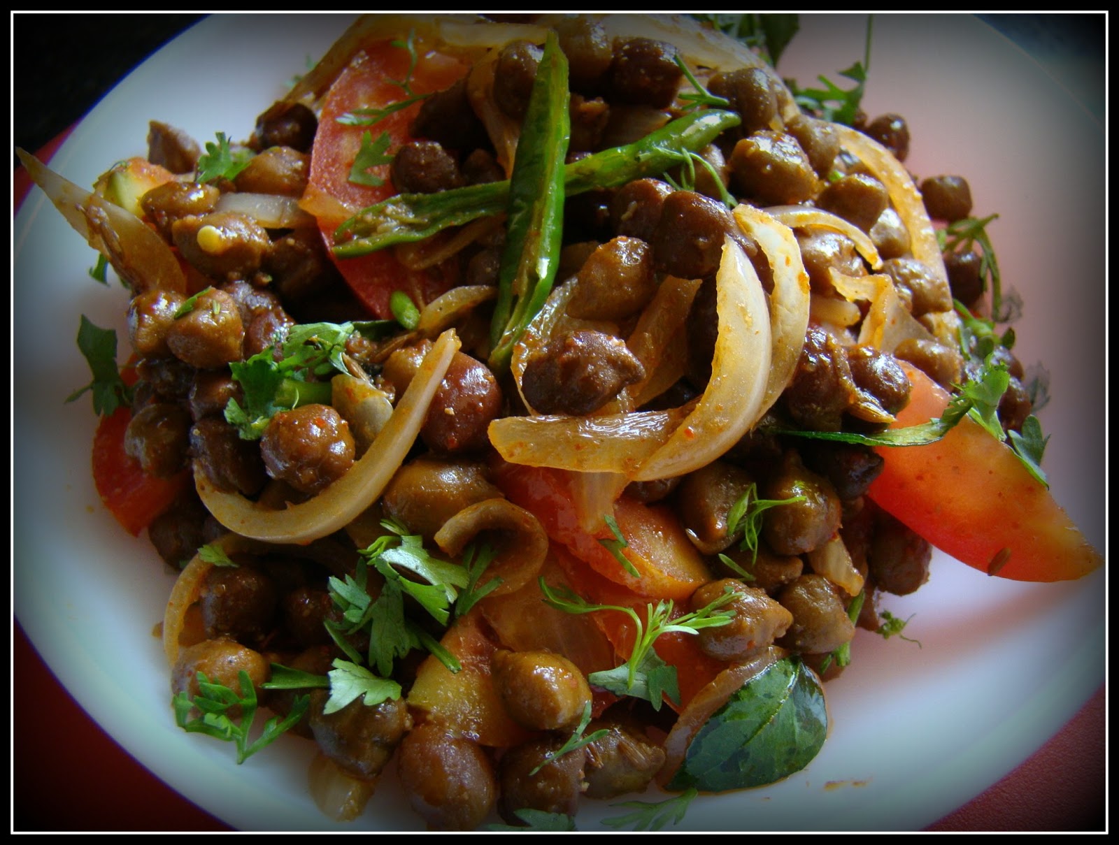 Add Onions and tomatoes and mix well . Add kala chana , salt , amchur powder and mix well. Switch off flame . Add Coriander Leaves and serve it.