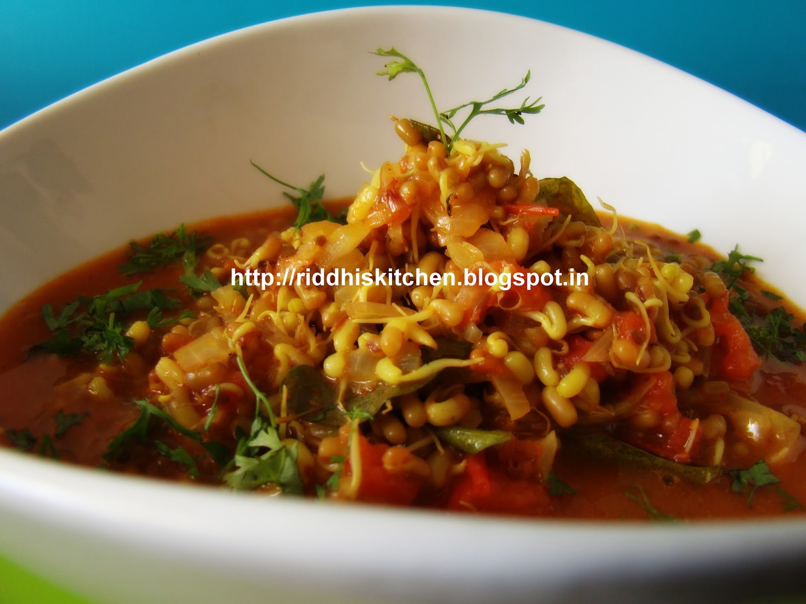 Heat oil in kadai , add cumin seeds , hing , curry leaves , Onions , ginger paste , garlic saute for 2 to 3 minutes . add tomatoes and saute for 2 to 3 minutes . add sprouts, salt , red chilli powder , turmeric powder , sambhar masala and mix well . cook for 2 minutes . add water mix well and cook for 5 to 6 minutes . switch off the flame , add lemon juice and coriander leaves and serve hot with roti or rice .
